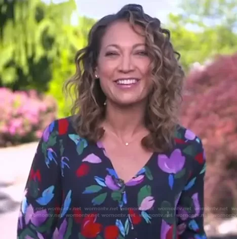 Ginger Zee on Good Morning America on ABC was spotted wearing this black floral wrap top on Good Morning America on Jun 23 2021's episode. Ginger's Top is the Alyssa Wrap Front Peplum Blouse by Parker.