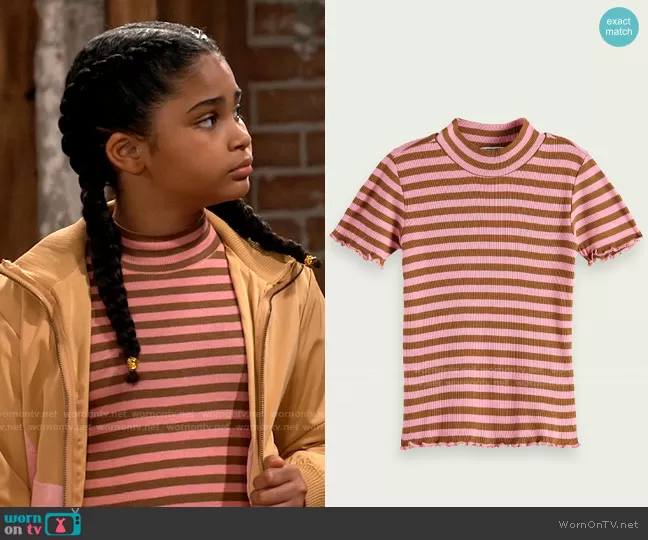 Millicent (played by Jaidyn Triplett) on iCarly on Paramount+ was spotted wearing this pink striped top and star jacket on iCarly on episode 'iStart Over' (1x01) in Jun 2021. Millicent's Top is the Frilly high neck T-shirt by Scotch & Soda . Millicent's Jacket is the Star Jacket in Honey Yellow by Molo.