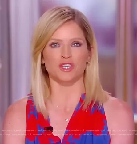 Sara Haines on The View on ABC was spotted wearing this red floral print dress on The View on Jun 25 2021's episode. Sara's Dress is the Marlowe Dress by Velvet.