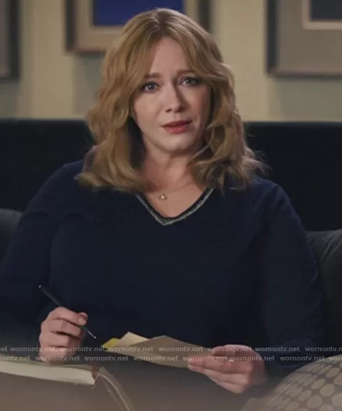 Beth Boland (played by Christina Hendricks) on Good Girls on NBC was spotted wearing this blue metallic trim sweater on Good Girls on episode 'We're Even' (4x13) in Jul 2021. Beth's Sweater is the V-Neck Metallic Trim Jumper by Gerard Darel.