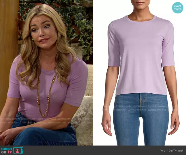 Shauna Fulton (played by Denise Richards) on The Bold and the Beautiful on CBS was spotted wearing this purple top on The Bold and the Beautiful on Jun 25 2021's episode. Shuana's Top is the Crewneck Short-Sleeves Tee by Vince.