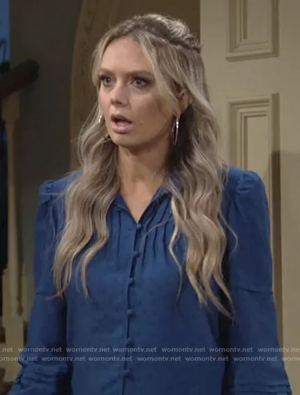 Abby Newman (played by Melissa Ordway) on The Young and the Restless on CBS was spotted wearing this blue button down top on The Young and the Restless on Jun 25 2021's episode. Abby's Top is the Rylee Top by Veronica Beard.