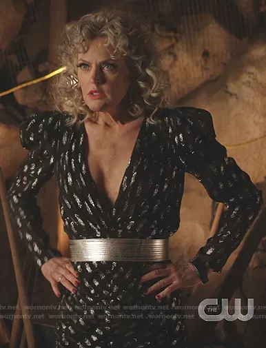 Alexis Carrington (played by Elaine Hendrix) on Dynasty on The CW was spotted wearing this metallic plunge neck dress on Dynasty on episode 'Equal Justice for the Rich' (4x09) in Jul 2021. Alexis's Dress is the Astrid Plunging Neckline Bodycon Dress by Ronny Kobo . Alexis's Belt is the Kiara Belt by Veronica Beard . Alexis's Shoes is the Venus Sandals by Veerah.