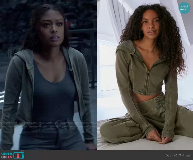 Ryan Wilder (played by Javicia Leslie) on Batwoman on The CW was spotted wearing this cropped hoodie on Batwoman on episode 'Power' (2x18) in Jun 2021. Ryan's Sweatshirt is the Aubrey Cropped Zip-Front Sweatshirt by Out from Under at Urban Outfitters.