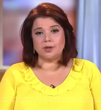 Ana Navarro on The View on ABC was spotted wearing this Ana yellow ruffle neck sweater on The View on Jun 28 2021's episode. Ana's Sweater is the INC Ruffled Ribbed Sweater by INC International Concepts.