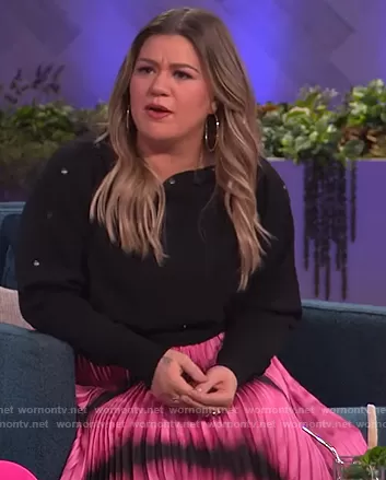 Kelly Clarkson on The Kelly Clarkson Show on NBC was spotted wearing this black button embellished sweater and tie dye skirt on The Kelly Clarkson Show on Jun 28 2021's episode. Kelly's Sweater is the Eli Button-Trim Sweater by All Saints . Kelly's Skirt is the Katz Tie Dyed Pleated Midi Skirt by Alice + Olivia.