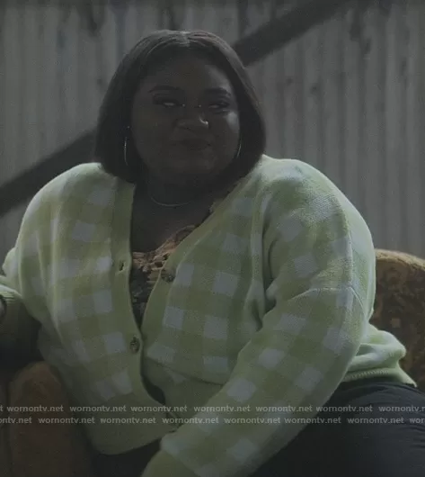 (played by ) on The Chi on ShowTime was spotted wearing this green check cropped cardigan on The Chi on episode 'Candyman' (4x06) in Jun 2021. 's Sweater is the Cropped Knit Cardigan by Monki.