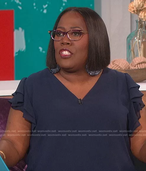 Sheryl Underwood on The Talk on CBS was spotted wearing this blue ruffle sleeve top on The Talk on Jun 28 2021's episode.