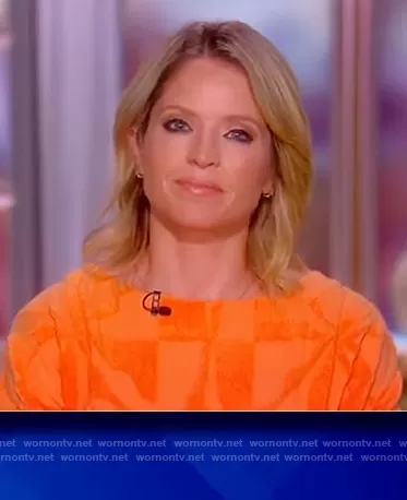 Sara Haines on The View on ABC was spotted wearing this orange knit mini dress on The View on Jun 29 2021's episode. Sara's Dress is the Sol belted cotton-terry mini dress by Lucy Folk.