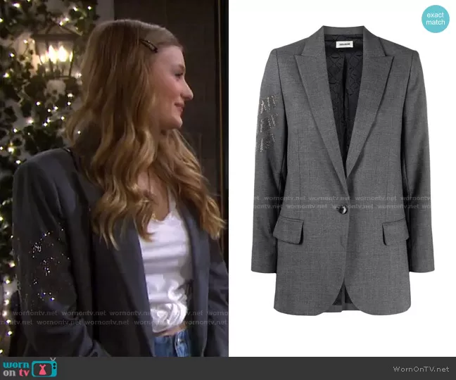 Alice Caroline Horton (played by Lindsay Arnold) on Days of our Lives on Peacock was spotted wearing this grey embellished sleeve blazer on Days of our Lives on Jun 30 2021's episode. Allie's Jacket is the Rhinestone-Embellished Blazer by Zadig & Voltaire.