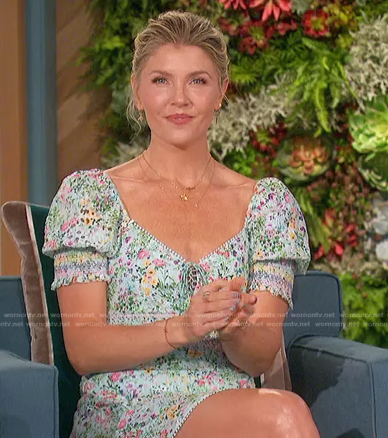 Amanda Kloots on The Talk on CBS was spotted wearing this blue floral print sweetheart dress on The Talk on Jun 30 2021's episode. Amanda's Dress is the Crawford Sweetheart Puff-Sleeve Dress by Alice + Olivia.