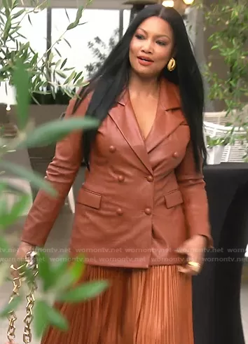 Garcelle Beauvais on The Real Housewives of Beverly Hills on Bravo was spotted wearing this Garcelle’s brown leather blazer and pleated skirt on The Real Housewives of Beverly Hills on episode 'Defining Women' (11x07) in Jul 2021. Garcelle's Jacket is the The Nightingale Faux Leather Blazer by Blank NYC . Garcelle's Skirt is the Demi Skirt by A.L.C. . Garcelle's Shoes is the Tsarou Pompom Pumps by Christian Louboutin.