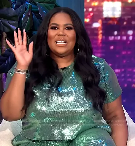 Nina Parker on E! News on E! was spotted wearing this green sequin top and pants on E! News Nightly Pop on Jun 28 2021's episode. Nina's Top is the Trendy Plus Size Sequin Cropped Top by Nina Parker . Nina's Pants is the Trendy Plus Size Sequin Joggers by Nina Parker.