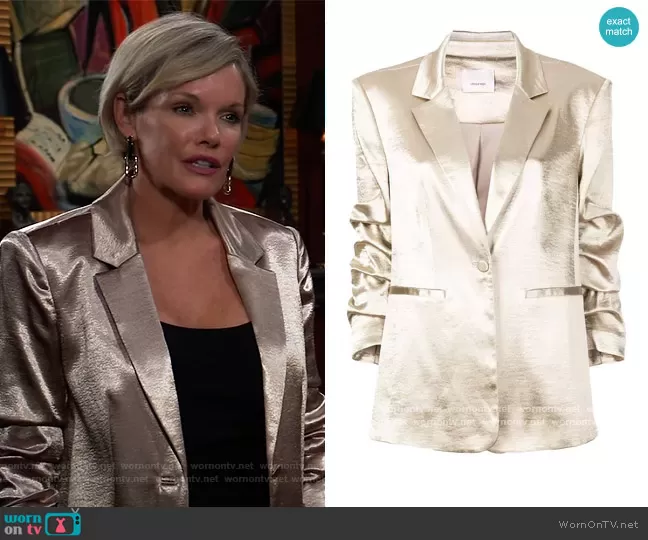 Ava Jerome (played by Maura West) on General Hospital on ABC was spotted wearing this metallic ruched blazer on General Hospital on Oct 12 2021's episode. Ava's Blazer is the Kylie blazer by Cinq a Sept.