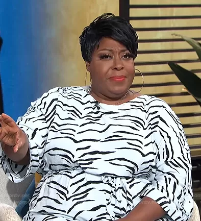 Loni Love on E! News on E! was spotted wearing this white zebra print jumpsuit on E! News Daily Pop on Jul 02 2021's episode. Loni's Jumpsuit is the Tie Waist Jumpsuit in Tiger Print by Asos Curve.