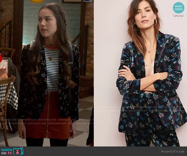 Nini (played by Olivia Rodrigo) on High School Musical The Musical The Series on Disney was spotted wearing this floral velvet blazer and zip front skirt on High School Musical The Musical The Series on episode 'Most Likely To' (2x08) in Jul 2021. Nini's Jacket is the Blooming Velvet Blazer by etttwa at Anthropologie . Nini's Skirt is the Virgo Zip Front Skirt by Free People.