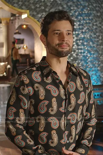 Sam Flores (played by Rafael de la Fuente) on Dynasty on The CW was spotted wearing this black paisley print shirt on Dynasty on episode 'Your Sick and Self-Serving Vendetta' (4x08) in Jun 2021. Sam's Shirt is the Multicolor Cashmere Shirt by Garcons Infideles.