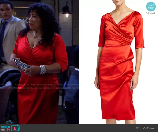 Paulina Price (played by Jackée Harry) on Days of our Lives on Peacock was spotted wearing this red satin wrap dress on Days of our Lives on Jul 04 2021's episode. Paulina's Dress is the V-Neck Elbow-Sleeve Ruched Satin Dress by Chiara Boni La Petite Robe.