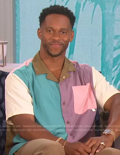 on The Talk on CBS was spotted wearing this colorblock shirt on The Talk on Jul 07 2021's episode. 's Shirt is the Colorblock Short Sleeve Button-Up Shirt by Scotch and Soda.