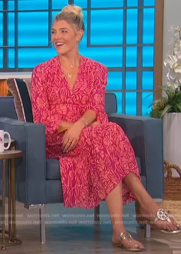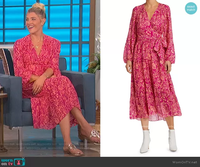 Amanda Kloots on The Talk on CBS was spotted wearing this pink floral wrap dress on The Talk on Jul 07 2021's episode. Amanda's Dress is the Liza Floral Print Silk Midi Wrap Dress by Tanya Taylor.