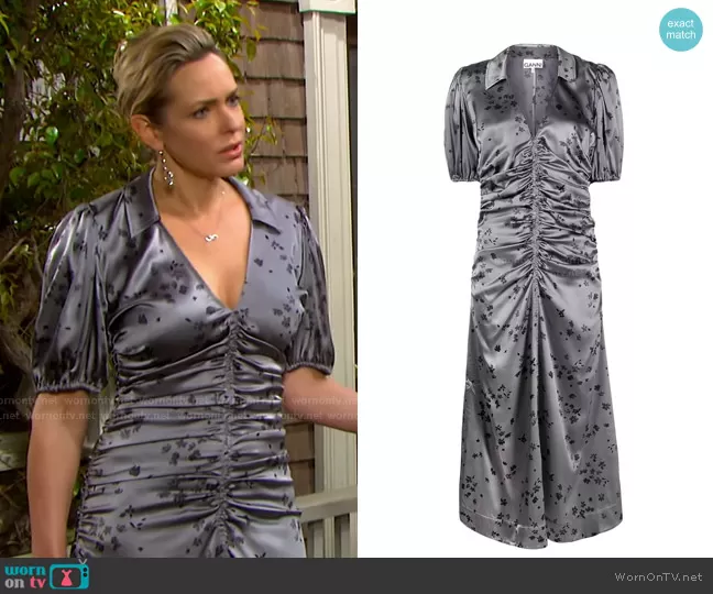 Nicole Walker (played by Arianne Zucker) on Days of our Lives on Peacock was spotted wearing this grey floral ruched dress on Days of our Lives on Jul 08 2021's episode. Nicole's Dress is the Floral Ruched Stretch Silk Satin Dress by Ganni.