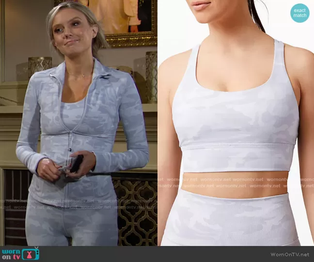 Abby Newman (played by Melissa Ordway) on The Young and the Restless on CBS was spotted wearing this grey camo print workout outfit on The Young and the Restless on Jul 08 2021's episode. Abby's Bra is the Energy Bra in Incognito Camo Alpine White Multi by Lululemon . Abby's Jacket is the Define Jacket in Incognito Camo Jacquard Alpine White Starlight by Lululemon . Abby's Leggings is the Wunder Under High-Rise Tight in Incognito Camo Jacquard Alpine White Starlight by Lululemon.