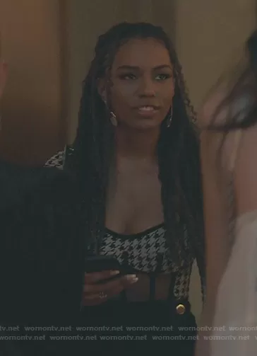 Monet de Haan (played by Savannah Lee Smith) on Gossip Girl on HBO Max was spotted wearing this houndstooth mesh waist top on Gossip Girl on episode 'Just Another Girl on the MTA' (1x01) in Jul 2021. Monet's Bodysuit is the Houndstooth Net Corset Bodysuit by David Koma . Monet's Skirt is the Renna Button-Wrap Miniskirt by Alice + Olivia . Monet's Bag is the Miss Vivier Buckle Bag by Roger Vivier.