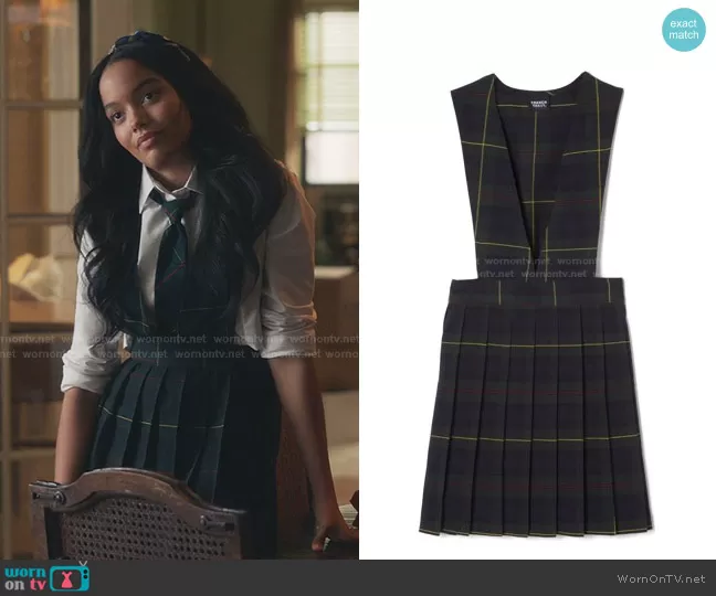 Zoya Lott (played by Whitney Peak) on Gossip Girl on HBO Max was spotted wearing this green plaid pinafore dress on Gossip Girl on episode 'Just Another Girl on the MTA' (1x01) in Jul 2021. Zoya's Dress is the V-Neck Jumper by French Toast . Zoya's Tie is the Adjustable Plaid Tie by French Toast . Zoya's Shoes is the Superstar Leather Platform Sneakers by Adidas x Beyonce.