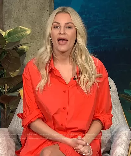 Morgan Stewart on E! News on E! was spotted wearing this red button down shirt and shorts on E! News Daily Pop on Jul 09 2021's episode. Morgan's Top is the Lui Organic Cotton Shirt by The Frankie Shop . Morgan's Shorts is the Lui Organic Cotton Shorts by The Frankie Shop . Morgan's Shoes is the BV Curve sandals by Bottega Veneta.
