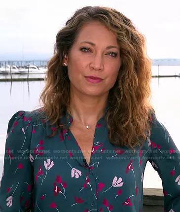 Ginger Zee on Good Morning America on ABC was spotted wearing this green floral blouse on Good Morning America on Jul 12 2021's episode. Ginger's Top is the Myella Top by Joie.