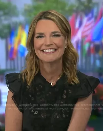 Savannah Guthrie on Today on NBC was spotted wearing this black floral embroidered ruffle dress on Today on Aug 12 2021's episode. Savannah's Dress is the Sahara Dress by Veronica Beard.