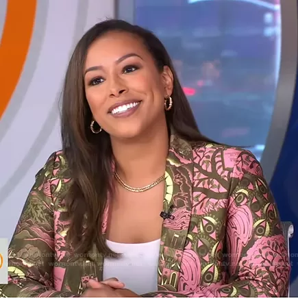 on Good Morning America on ABC was spotted wearing this pink printed blazer on Good Morning America on Jul 13 2021's episode. 's Jacket is the Double-Breasted Pattern Blazer by Scotch & Soda.