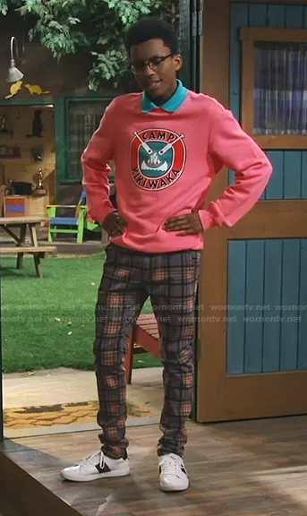 Noah Lambert (played by Israel Johnson) on Bunkd on Disney was spotted wearing this purple check pants on Bunkd on episode 'Camp Creepy-Waka' (5x18) in Jul 2021. Noah's Pants is the Tartan Skinny Pants by Urban Outfitters.