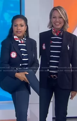Dylan Dreyer on Today on NBC was spotted wearing this navy striped top and blazer on Today on Jul 14 2021's episode. Dylan's Top is the Team USA Opening Ceremony Tee by Ralph Lauren x Team USA . Dylan's Jacket is the Team USA Opening Ceremony Slim Fit Blazer by Ralph Lauren x Team USA . Dylan's Pants is the Team USA Skinny Jeans in Indigo Blue by Ralph Lauren x Team USA . Dylan's Scarf is the Team USA Opening Ceremony Scarf by Ralph Lauren x Team USA . Dylan's Belt is the Team USA Closing Ceremony Belt by Ralph Lauren x Team USA.