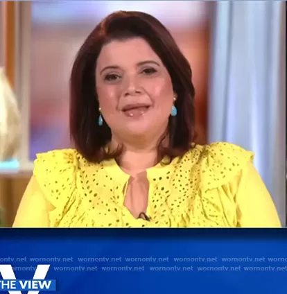 Ana Navarro on The View on ABC was spotted wearing this yellow eyelet top on The View on Jul 14 2021's episode. Ana's Top is the INC Lace-Trim Cotton Top by INC International Concepts.