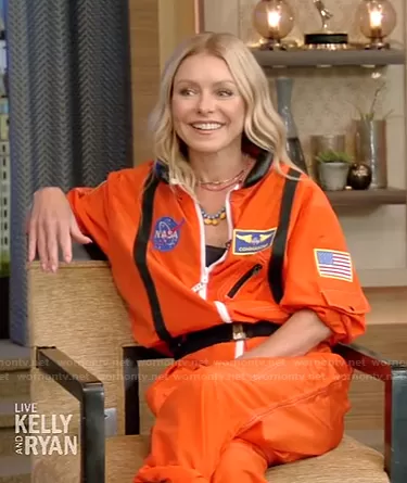 Kelly Ripa on Live with Kelly and Mark on Disney ABC Home Entertainment was spotted wearing this orange astronaut jumpsuit on Live with Kelly and Ryan on Jul 14 2021's episode. Kelly's Jumpsuit is the Astronaut Suit by Aeromax.