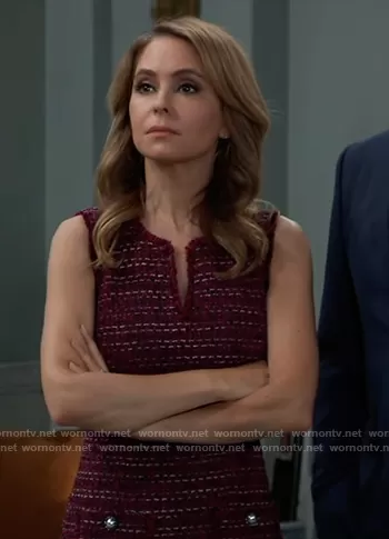 Olivia Falconeri (played by Lisa Lo Cicero) on General Hospital on ABC was spotted wearing this red sleeveless tweed dress on General Hospital on Jul 15 2021's episode. Olivia's Dress is the Sleeveless Tweed Dress by Karl Lagereld Paris.