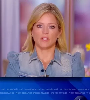 Sara Haines on The View on ABC was spotted wearing this denim puff shoulder dress on The View on Jul 15 2021's episode. Sara's Dress is the Lema Puff Sleeve Denim Dress by Retrofete.