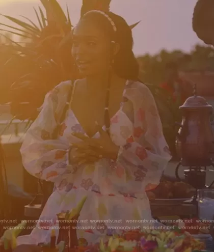 Zoey Johnson (played by Yara Shahidi) on Grown-ish on Freeform was spotted wearing this white floral sheer dress on Grown-ish on episode 'Drunk in Love' (4x02) in Jul 2021. Zoey's Dress is the Mini Meadow Babydoll Dress Staud.