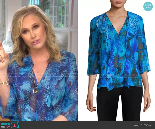 Kathy Hilton on The Real Housewives of Beverly Hills on Bravo was spotted wearing this blue peacock feather print blouse on The Real Housewives of Beverly Hills on episode 'A Pretty Meltdown' (11x09) in Jul 2021. Kathy's Top is the Faith Peacock-Print Blouse by Elie Tahari.
