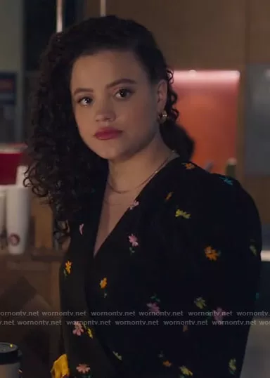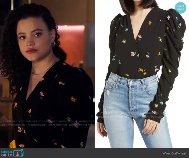 Maggie Vera (played by Sarah Jeffery) on Charmed on The CW was spotted wearing this black floral wrap top on Charmed on Jun 25 2021's episode. Maggie's Top is the Danna Bodysuit in Noir Spring by AFRM.