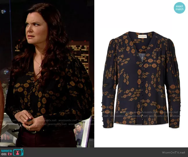 Katie Logan (played by Heather Tom) on The Bold and the Beautiful on CBS was spotted wearing this printed button down blouse on The Bold and the Beautiful on Jul 15 2021's episode. Katie's Top is the Annika Paisley Blouse by Nicholas.