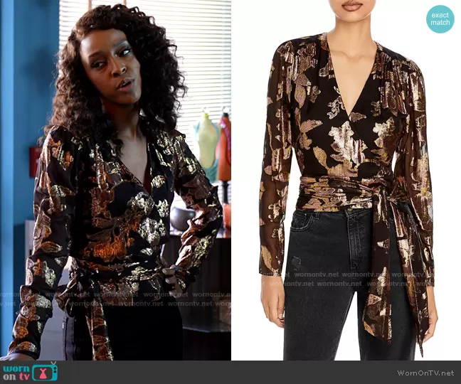 Karen Mott (played by Ebony Obsidian) on Tyler Perrys Sistas on BET was spotted wearing this black and gold floral wrap blouse on Tyler Perrys Sistas on episode 'The Chase' (3x06) in Jul 2021. Karen's Top is the Blair Top by Ramy Brook.
