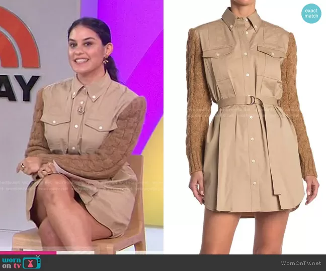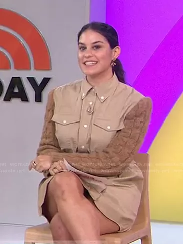 Donna Farizan on Today on NBC was spotted wearing this beige cable knit sleeve shirtdress on Today on Jul 19 2021's episode. Donna's Dress is the Vivian Mixed Media Shirt Dress by Derek Lam 10 Crosby . Donna's Shoes is the Paily Slide Sandal by Dolce Vita.