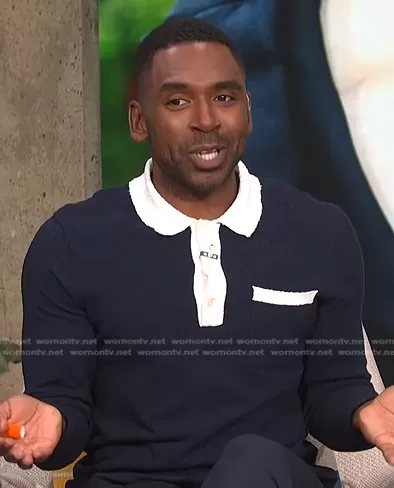 Justin Sylvester on E! News on E! was spotted wearing this navy long sleeve polo shirt on E! News Daily Pop on May 03 2022's episode. Justin's Shirt is the Long Sleeve Boucle Polo by Todd Snyder .