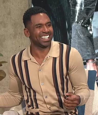 Justin Sylvester on E! News on E! was spotted wearing this beige striped cardigan on E! News Daily Pop on Feb 24 2022's episode. Justin's Sweater is the Striped Button Down Sweater Polo by Todd Snyder.