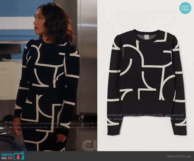 Iris West (played by Candice Patton) on The Flash on The CW was spotted wearing this black and white geometric sweater and skirt set on The Flash on episode 'Heart of the Matter (2)' (7x18) in Jul 2021. Iris's Sweater is the Jacquard Knit Sweater by H&M . Iris's Skirt is the Jacquard Knit Skirt by H&M.