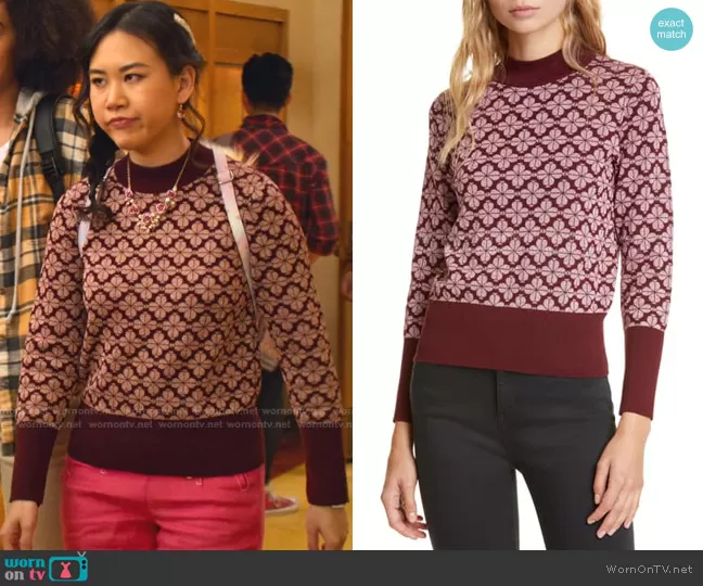 Eleanor Wong (played by Ramona Young) on Never Have I Ever on Netflix was spotted wearing this Eleanor’s burgundy floral sweater on Never Have I Ever on episode '...Betrayed a Friend' (2x06) in Jul 2021. Eleanor's Sweater is the Floral Spade Pima Cotton Sweater by Kate Spade.