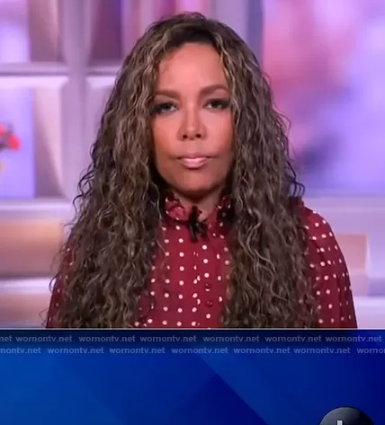 Sunny Hostin on The View on ABC was spotted wearing this burgundy polka dot blouse on The View on Jul 21 2021's episode. Sunny's Top is the Ruffled high-neck polka-dot satin blouse by Zimmermann.