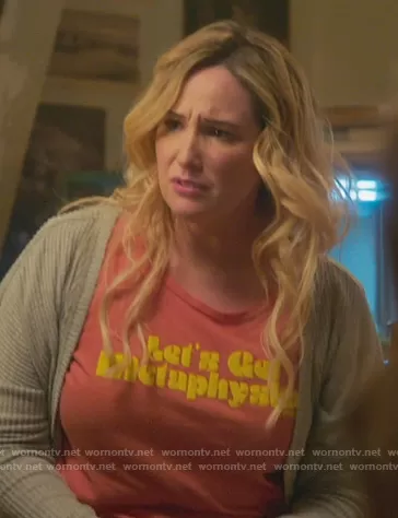Davia (played by Emma Hunton) on Good Trouble on Freeform was spotted wearing this pink metaphysical tee on Good Trouble on episode 'Shame' (3x12) in Jul 2021. Davia's Top is the Metaphysical Tee by Mother.